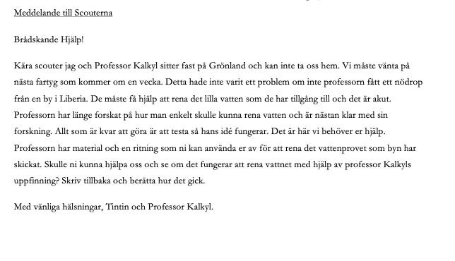 Först får patrullen Tintins meddelande tillsammans med vattenprovet i en burk. Vattenprovet blandar ledarna till i förväg enligt instruktioner nedan.